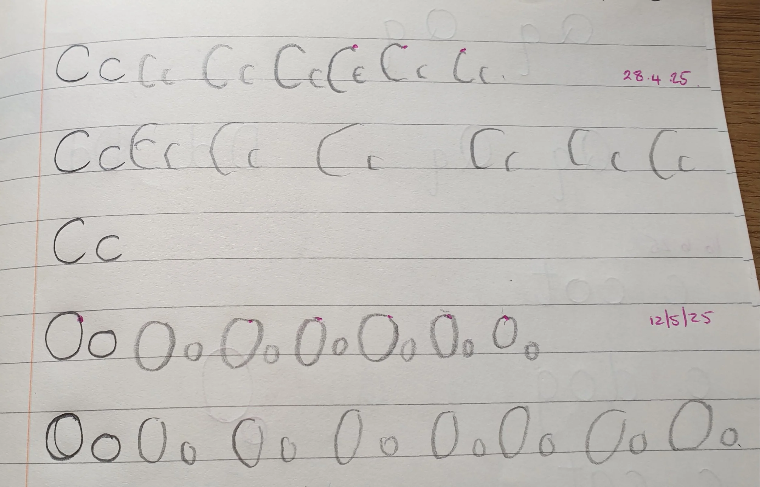 Examples from handwriting sessions, as the letter formation improves and the letters begin to have even size and sitting on the line.